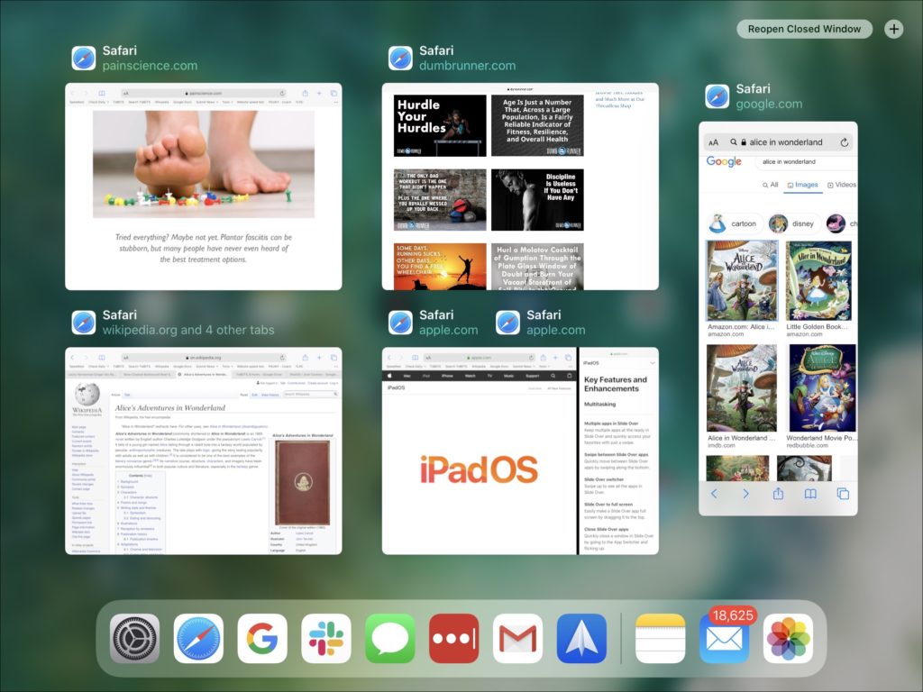 And if you aren’t sure which space has a particular Safari window, for instance, tap and hold the Safari icon in the Dock (or anywhere else) and choose Show All Windows to see all the spaces—including Slide Over—that include Safari windows (Apple calls this App Exposé).