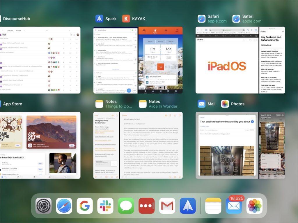 With all these possibilities, it’s easy to get confused about what’s open where. The iPadOS app switcher now displays thumbnails of the Split View spaces so you can switch among them easily.