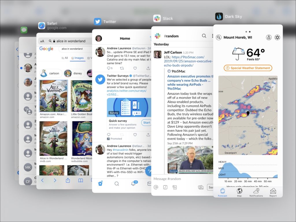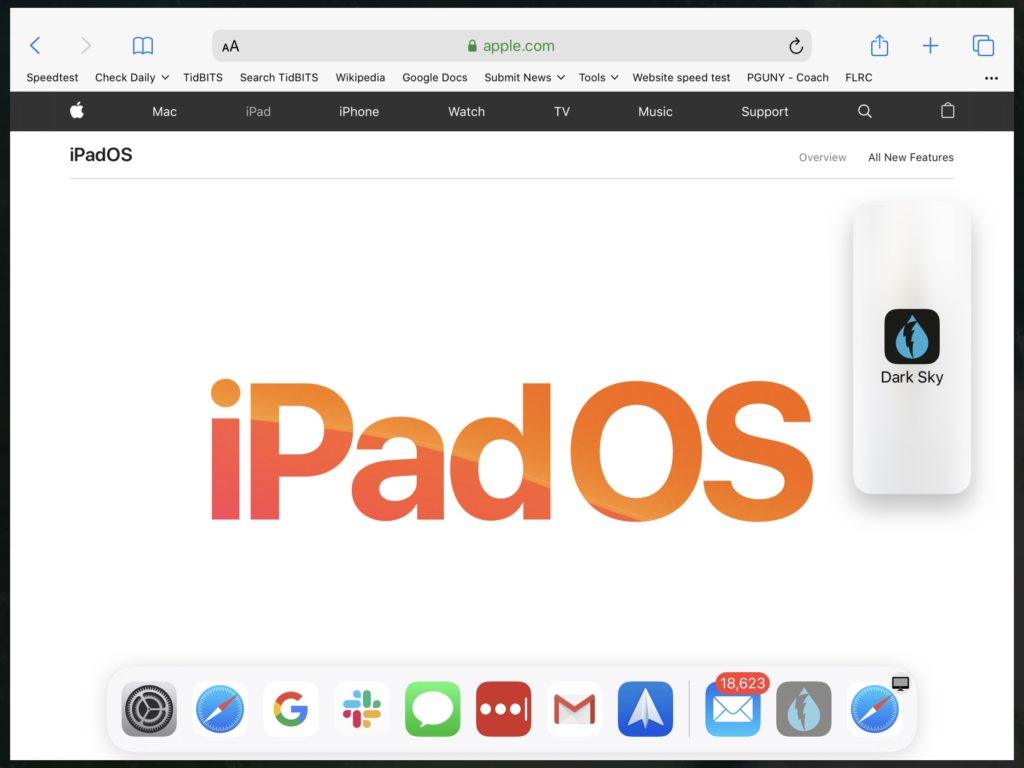 Say you’re working on your iPad, perhaps in Safari, and you want to keep an eye on your favorite weather app (we like Dark Sky) because an upcoming storm might affect your upcoming bike ride. You don’t need to see both apps all the time, but you also don’t want to have to switch back and forth. With Slide Over, you can put Dark Sky in a panel that floats over Safari and then hide and show it.