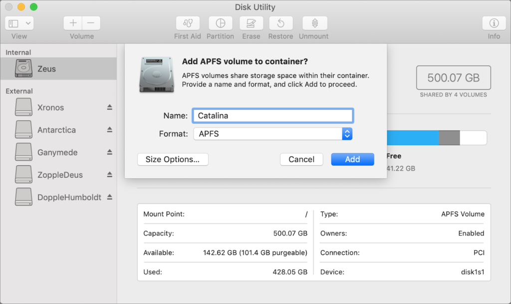 Finally, there’s one other option that lets you switch back and forth between Mojave and Catalina, assuming your Mac supports Mojave. You can create an APFS volume on your internal drive and install another version of macOS on that. It’s easy, and Apple provides full instructions. The only problem with this approach is that you’ll have to restart to switch operating systems, whereas both are available simultaneously with the virtualization solution.