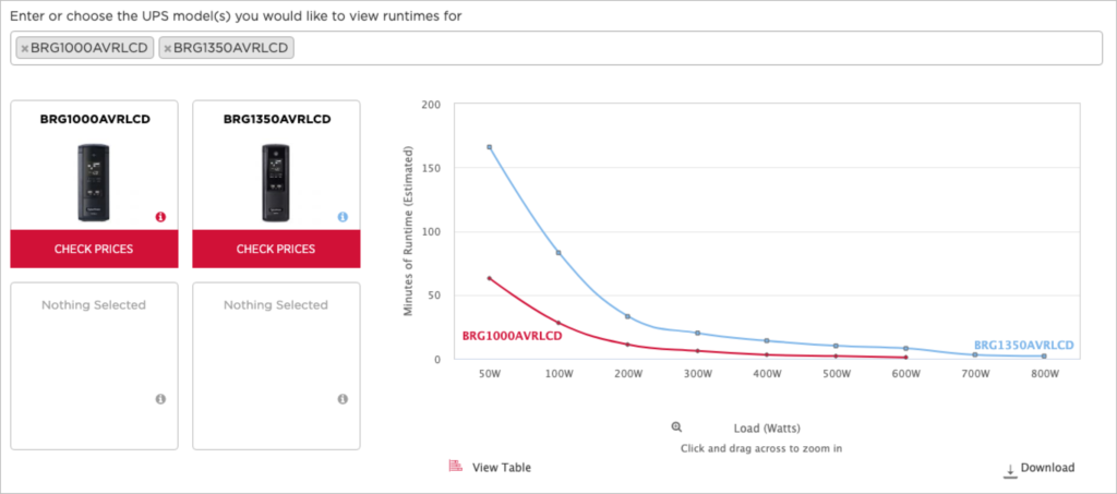 Here’s where things get fuzzy. The next step is to take that number and plug it into a UPS selector. Major manufacturers like APC (shown below), CyberPower, and Tripp Lite provide tools along these lines.