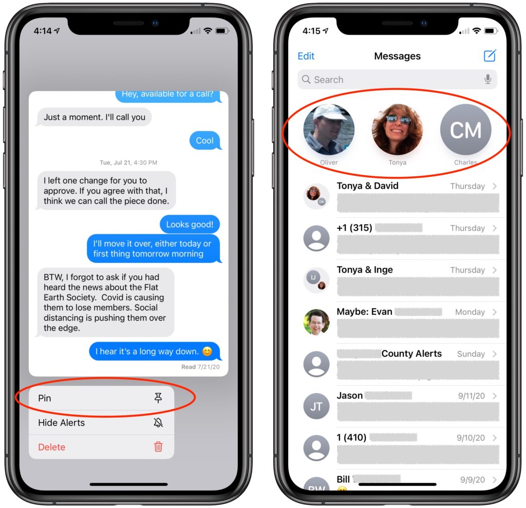 We all have individuals and groups that we converse with regularly in Messages. It’s frustrating to hunt through the list of conversations to find them, so iOS 14 adds the concept of “pinned” conversations. Touch and hold on any conversation in the list to bring up a preview of the last few messages and some commands. Then tap Pin to add the conversation to the top of the Messages screen as a circular icon. From then on, tap that icon to enter the conversation quickly.