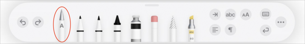 How you enter text into text-oriented apps varies a little by app. In Notes, when you tap the pencil button in the upper-left corner, and in Pages, when you tap the screen with your Apple Pencil, a toolbar appears at the bottom, and you have to tap the icon of the Apple Pencil with an A on it to enter Scribble mode.
