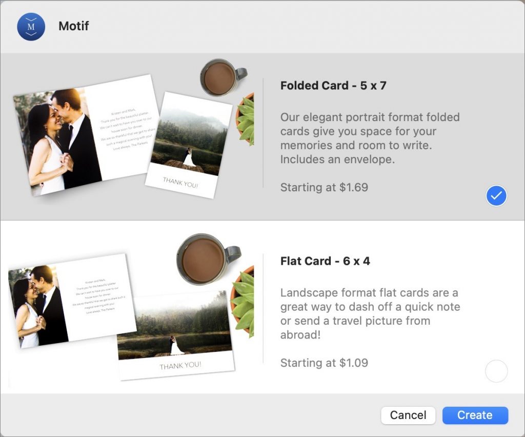 - Create the card: With your new album selected, choose File > Create > Card > Motif. Then select either a 5×7 folded card or a 4×6 flat double-sided card, in either portrait or landscape orientation.