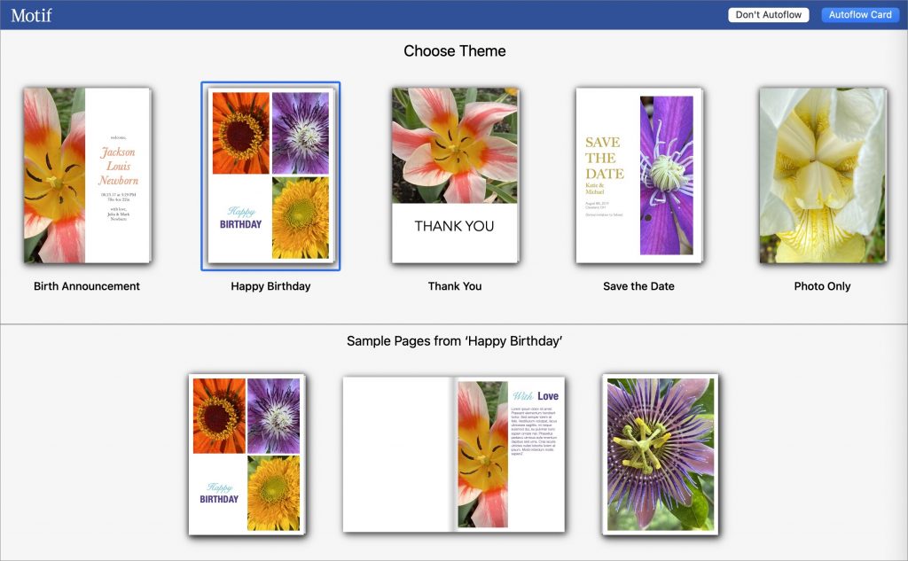 - Select a theme: Motif provides various themes, and although it doesn’t currently include any holiday themes for cards, they’re all completely customizable. Since cards have relatively few images, we recommend clicking Don’t Autoflow and placing images by hand. (For a book or a calendar, autoflow would be a boon.)