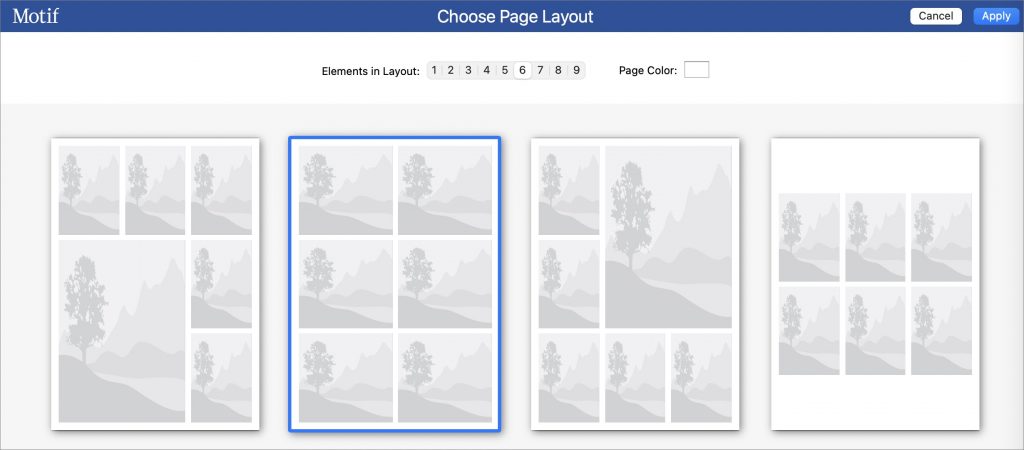 button below the page to open the Page Layout screen, click a number corresponding to how many images you want, and click the desired layout. (A bug in the current version prevents this from working on pages containing text blocks, but you can still tweak such pages—see the instructions below for adding, removing, resizing, and rearranging blocks.)