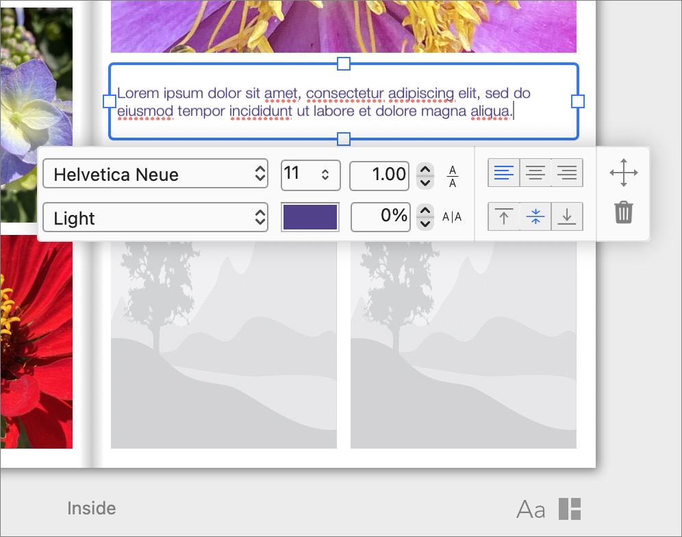- Overlay text: Once you’ve placed a text block on a page, resize or move it so it overlaps an image. If the text doesn’t appear because it’s underneath the image, choose Send Backward from the control bar’s Arrange menu.