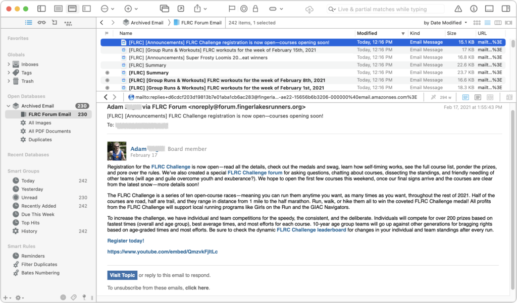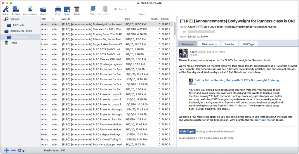 - Mail Archiver X ($49.95): Mail Archiver X focuses on email, supporting major email clients like Mail, Outlook, Postbox, and Thunderbird along with .mbox files, and it can even archive email directly from your IMAP or Gmail account. You can set up Mail Archiver X to archive email on a schedule, automatically skipping previously archived messages. It lets you store messages in its internal database format, FileMaker (if you have a license), or PDF.