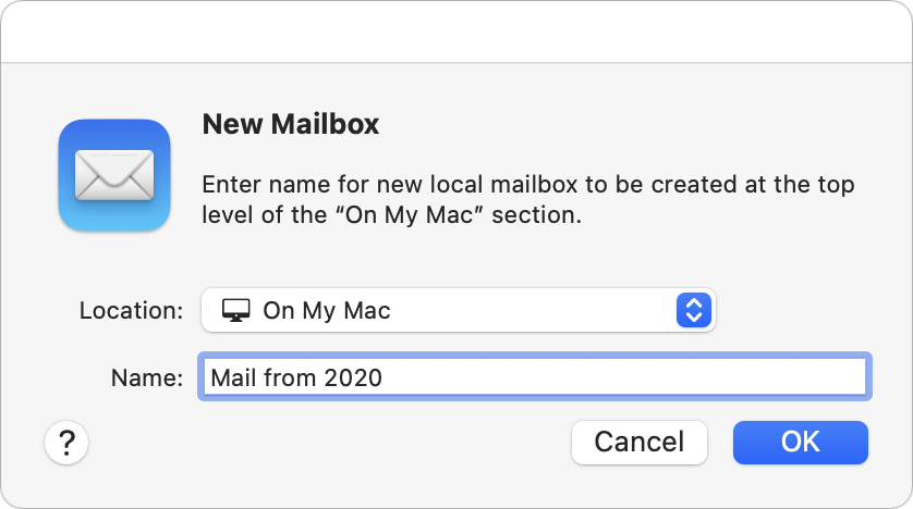 How you do this varies slightly by app, but let’s look at Apple’s Mail—other apps will be similar. The first step is to create a local mailbox. Choose Mailbox > New Mailbox and then choose On My Mac from the Location pop-up menu when naming it.