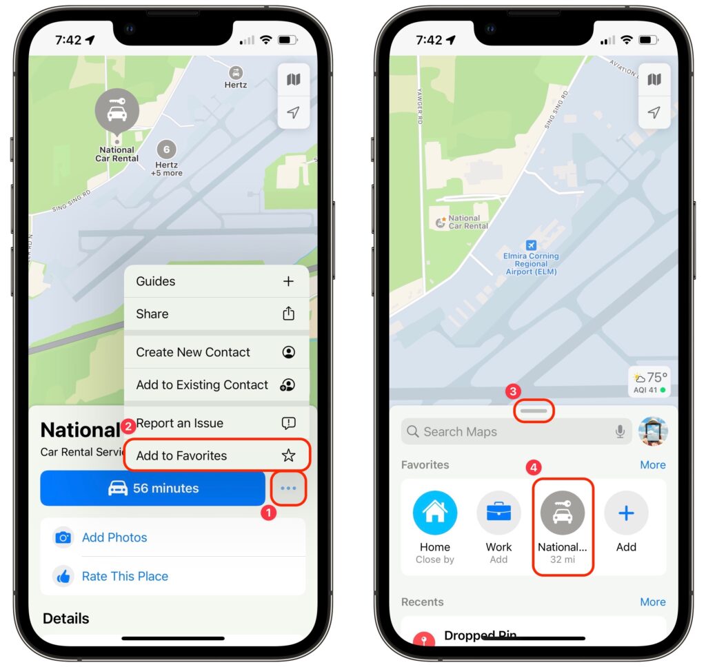 Imagine you’re on vacation, staying at an Airbnb and collecting tourist points in the surrounding area throughout the day. Since you’ll be heading back to your Airbnb regularly but may not remember its address reliably, it’s best to make it a favorite in Maps before you even leave home. That way, you can navigate to it easily without searching repeatedly or looking for it in your Recents list. Similarly, take a few minutes to add other addresses that you know you’ll need, such as the rental car dropoff spot. In Maps on the iPhone, tap the ••• button ➊ next to an address and then Add to Favorites ➋. Then, when it’s time to navigate, swipe up on the search handle ➌ and tap the favorite ➍ to get directions.