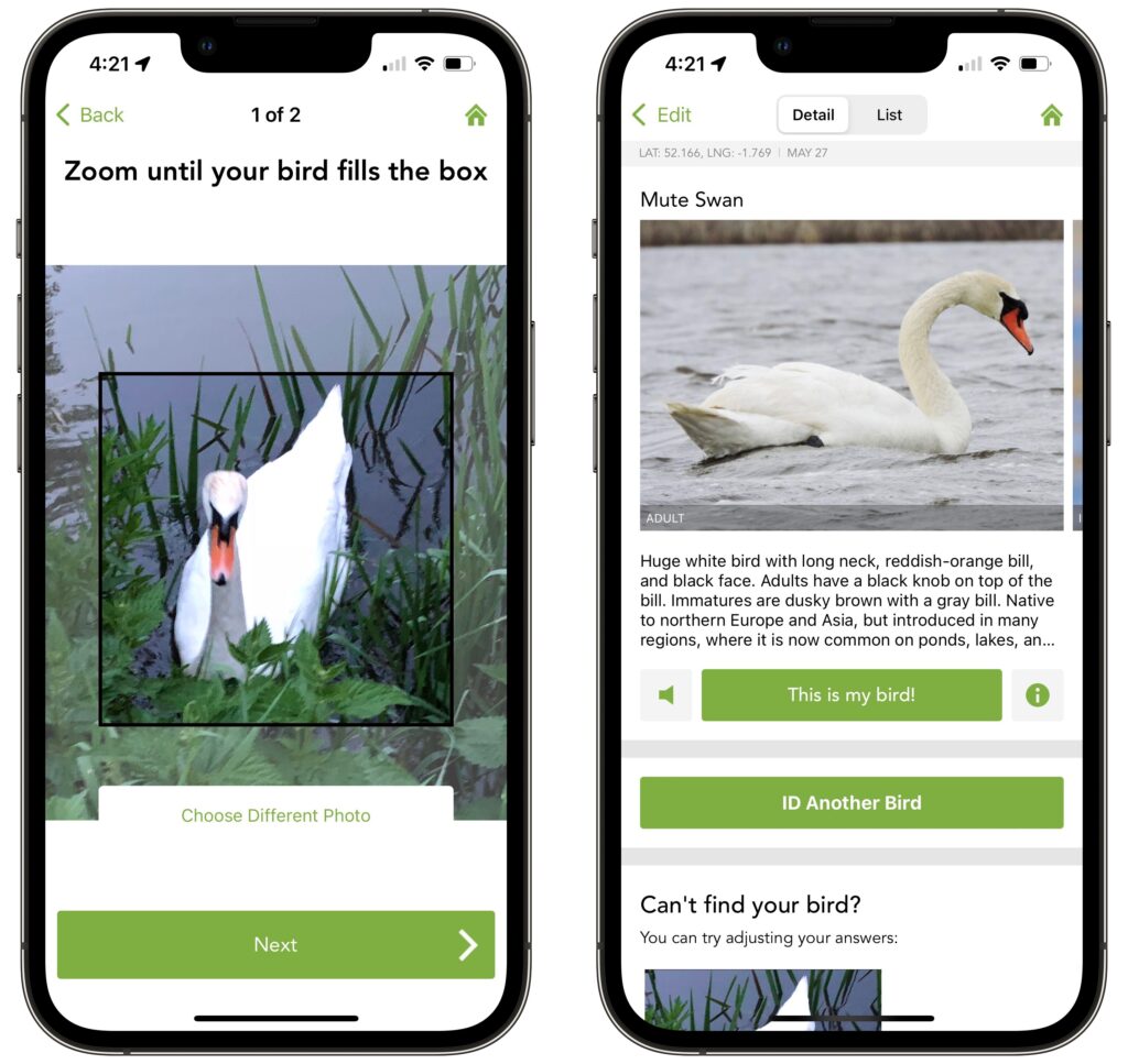 Merlin is also happy to identify a bird from a photo, which you can take from within the app or pull out of your Photos library. (Tip: When viewing your library from within Merlin, search for “bird” to find just the photos you might want to identify.) After you use a two-finger pinch-out gesture to zoom the photo to fit in the box, tap the Next button and confirm the photo’s location and date to see details about the bird. Again, if it’s right, tap the This Is My Bird button to add it to your list.