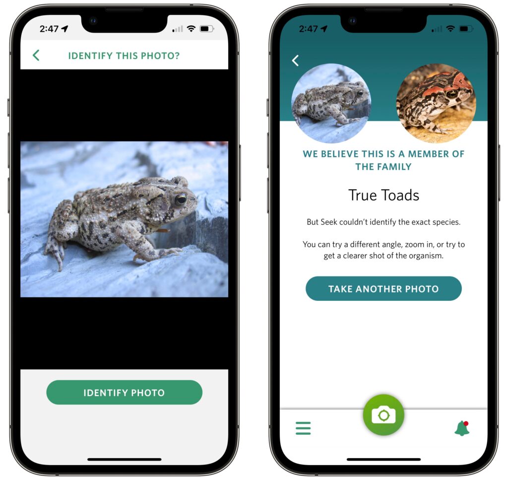 Beyond plants, Seek can identify amphibians, fungi, fish, reptiles, arachnids, birds, insects, mollusks, and mammals. It can be more difficult to get a spider or rodent to hold still while you point the camera at it, but you can also take a regular photo and have Seek identify it instead—just tap Photos at the bottom of the camera screen to select a photo from your library. If Seek recognizes the organism, it lets you add it to your observations, but it often has more trouble getting to the species level with a photo.