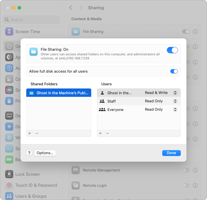 - File Sharing: Regularly copying files between Macs on the same network is best done with network file sharing. It’s fussy to set up, requiring one Mac to be set as the file server in Settings > General > Sharing > File Sharing. Then click the info icon to add shared folders, designate users, and set access privileges. (In macOS 14 Sonoma, the temporary “Allow full disk access for all users” option for the server Mac may simplify things.) To connect to the server Mac, in the Finder, choose Go > Network, and click the Connect As button to log in if necessary. On the plus side, once you’ve configured everything and made aliases or sidebar items for quick access, file sharing is easy and fast.