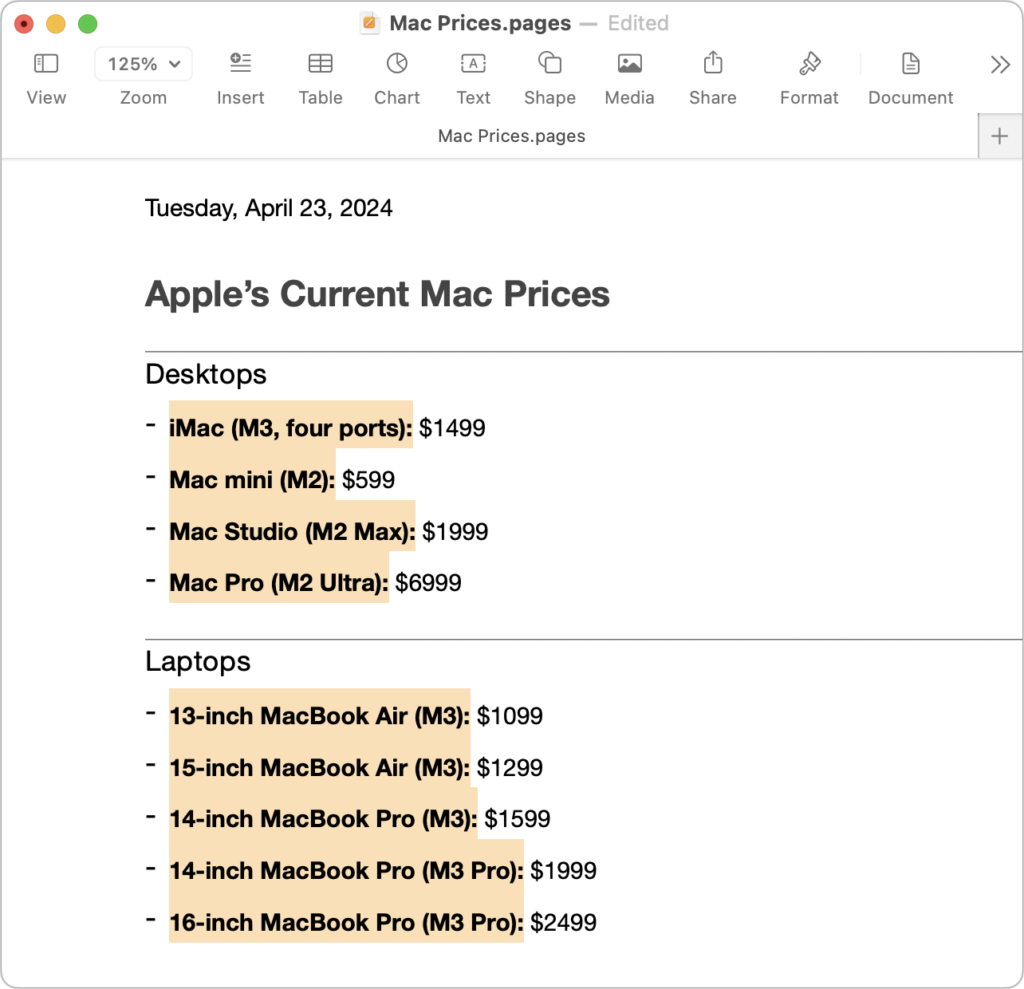 The latest versions of the Mac and iPad apps in Apple’s iWork suite—Pages 14, Keynote 14, and Numbers 14—have gained a helpful feature: non-contiguous text selection. By holding down the Command key, you can select chunks of text that aren’t next to each other. For example, imagine you want to make the first part of each item in a bullet list bold. Instead of bolding each one separately, hold down Command as you work to select all of them and then apply bold to the entire selection with a single command. Non-contiguous selection is particularly helpful when applying formatting, but you can also copy non-contiguously selected text or work with it in nearly any way you would interact with a contiguous text selection. (Note that while holding down Command, you can double-click to select words or triple-click to select paragraphs, just as you can normally without holding down Command.)