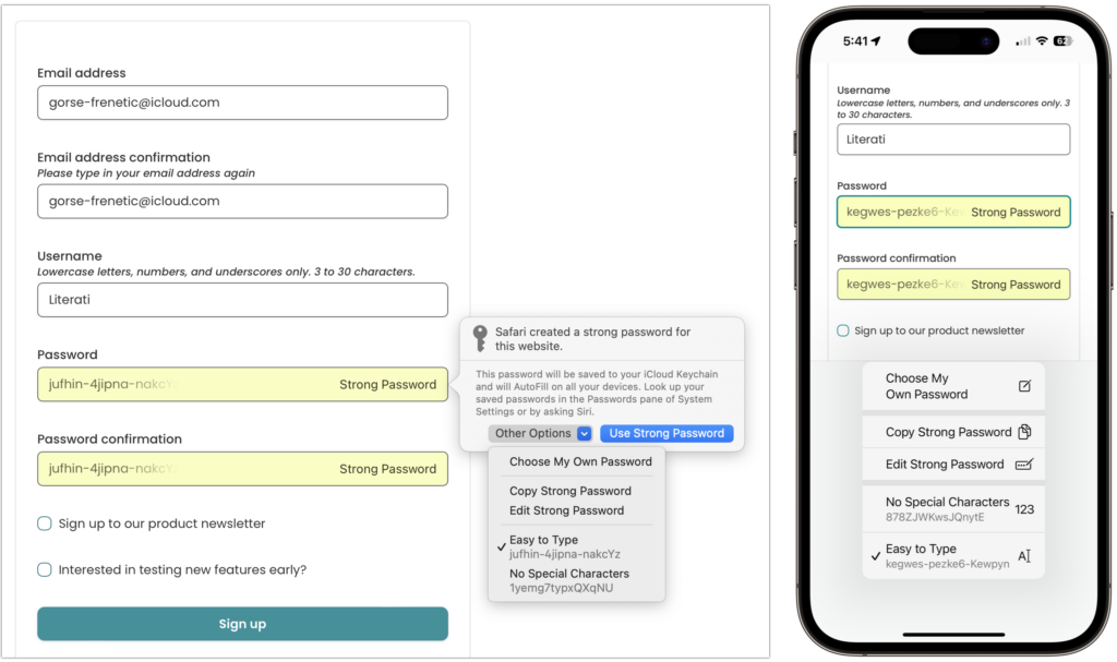 - Create a new login: When you need to create an account on a new website, after you enter whatever it wants for email or username, Safari creates a strong password for you. Unfortunately, the iCloud Passwords extension or add-on on the Mac can’t generate passwords—you can either create a strong password manually or switch to Safari temporarily to let it create one. When you submit your credentials, you’ll be prompted to save them.