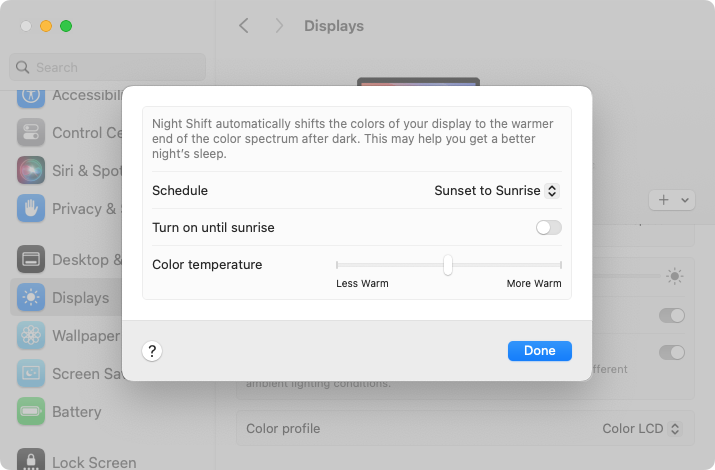 Research suggests that exposure to blue light fools your body into thinking it’s daytime, making it harder to fall asleep if you work late on a Mac with a bright white (which has a lot of blue light) screen. To help, a macOS feature called Night Shift subtly changes the colors of the screen as the sun sets to reduce the amount of blue light hitting your eyes. In essence, everything gets slightly warmer. To configure your Night Shift schedule—so it turns on and off automatically—go to System Settings > Displays > Night Shift. You can set any times, but Sunset to Sunrise adjusts for the sun’s movement in your location throughout the year. One warning: if you edit photos or videos, or work on graphics where specific colors matter, Night Shift’s color changes may be problematic.