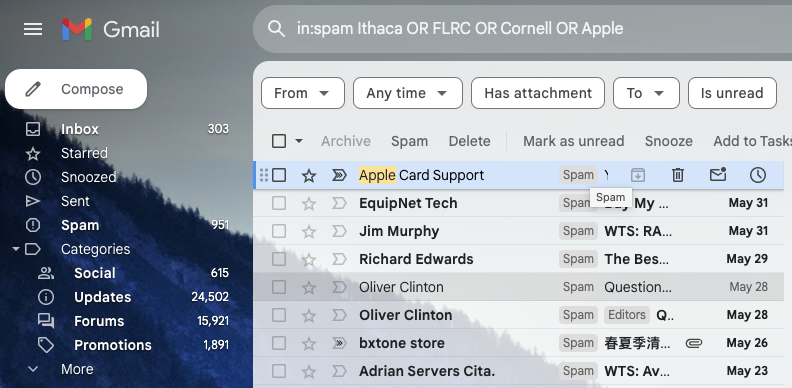 Spam filters work pretty well—99% of the messages in your spam mailbox are probably spam. But it’s frustrating to miss an important message that was caught by an overeager spam filter. Here’s an easy way to find many good messages, also known as “ham,” amidst all the spam. Think of keywords that might appear in legitimate email to you: the name of your city, major employers in your area, nearby colleges, companies whose products you use, their products, and so on. Then search for those terms inside your spam mailbox, either one at a time or, if your email app supports it, as a single search with OR statements for each keyword, like this Gmail search (use your actual town name and so forth): in:spam townName OR employerName OR clubName OR companyName. Of course, your keywords will appear in some spam messages, but if the searches reveal ham messages you would otherwise have missed, they’re worthwhile. Be extra cautious around any message that wants you to click a link, log in, or provide private information. The fact that your spam filter caught a message is a red flag.