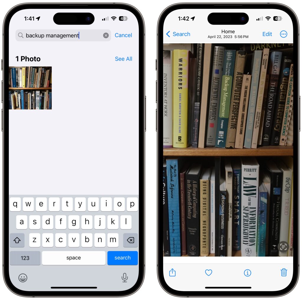 If you have trouble finding particular items across multiple shelves of books, labeled boxes, or anything else that’s clearly identified with a text name, take carefully composed photos that capture all the titles without glare. Later, you can search for any text in those photos to find them—tap the Search button in Photos on the iPhone or iPad, or use the Search field in Photos on the Mac. Photos highlights the search term on the found photo. (If Photos on the Mac doesn’t surface an expected photo, try again on your iPhone, which seems to get more hits on harder-to-read text.) This capability comes courtesy of Apple’s Live Text feature, which uses machine learning to identify text in photos. Think of it as the lazy person’s database!