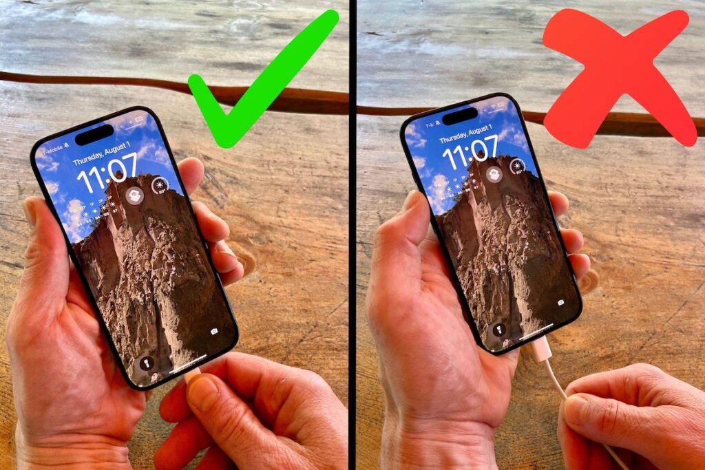- iPhones are fairly water resistant, but try to keep the charging port and cable plug clean and away from liquids. Pocket crud or a droplet in the wrong place could cause a short circuit. Because of their metal jackets, USB-C cables are less susceptible than Lightning to such problems, but it’s still worth being careful.