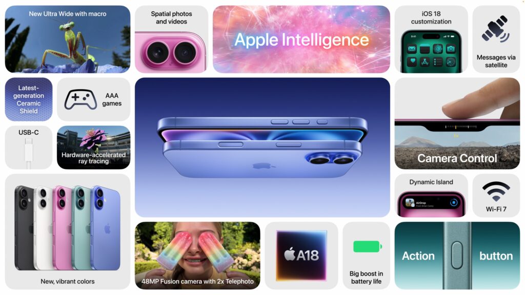 - A18 and A18 Pro chips for Apple Intelligence: The base iPhone 16 models are now powered by the new A18 chip, and the iPhone 16 Pro models get the faster A18 Pro. This key upgrade ensures the entire lineup will receive Apple Intelligence features once they ship in October in iOS 18.1. As far as we can tell, the Apple Intelligence feature set is the same across the board, but some features may work more quickly on the Pro models.