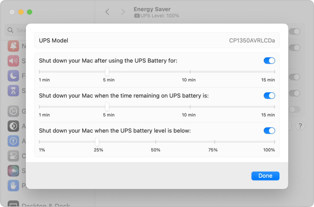 An uninterruptible power supply, or UPS, provides essential protection from power surges, spikes, brownouts, and outages. But if you’re not at your Mac when the power goes out, the UPS may run out of battery before you (or the power) return. Happily, if you connect your Mac to your UPS with a USB cable, macOS can detect the outage and shut your Mac down safely, regardless of what else is happening. Make sure open documents are saved whenever you step away from your Mac, or you could lose changes. In System Settings > Energy Saver > UPS Options, you can trigger the shutdown in three ways: after using the UPS battery for a specified amount of time, when the time remaining on the UPS battery hits a specific number, or when the UPS battery level drops below a particular percentage. There’s no harm in setting all three. Remember that it can take a minute or two for your Mac to shut down, so err on the short side for safety’s sake. Apple supports most UPS models from major manufacturers such as APC, CyberPower, and Tripp Lite.