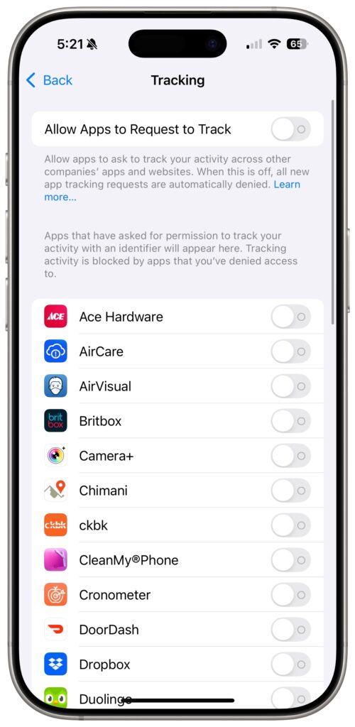 You’ll find the most important setting in Settings > Privacy & Security > Tracking. At the top of the screen is a switch labeled Allow Apps to Request to Track. Make sure that is off! If it has been on in the past, apps that have requested permission will appear below.