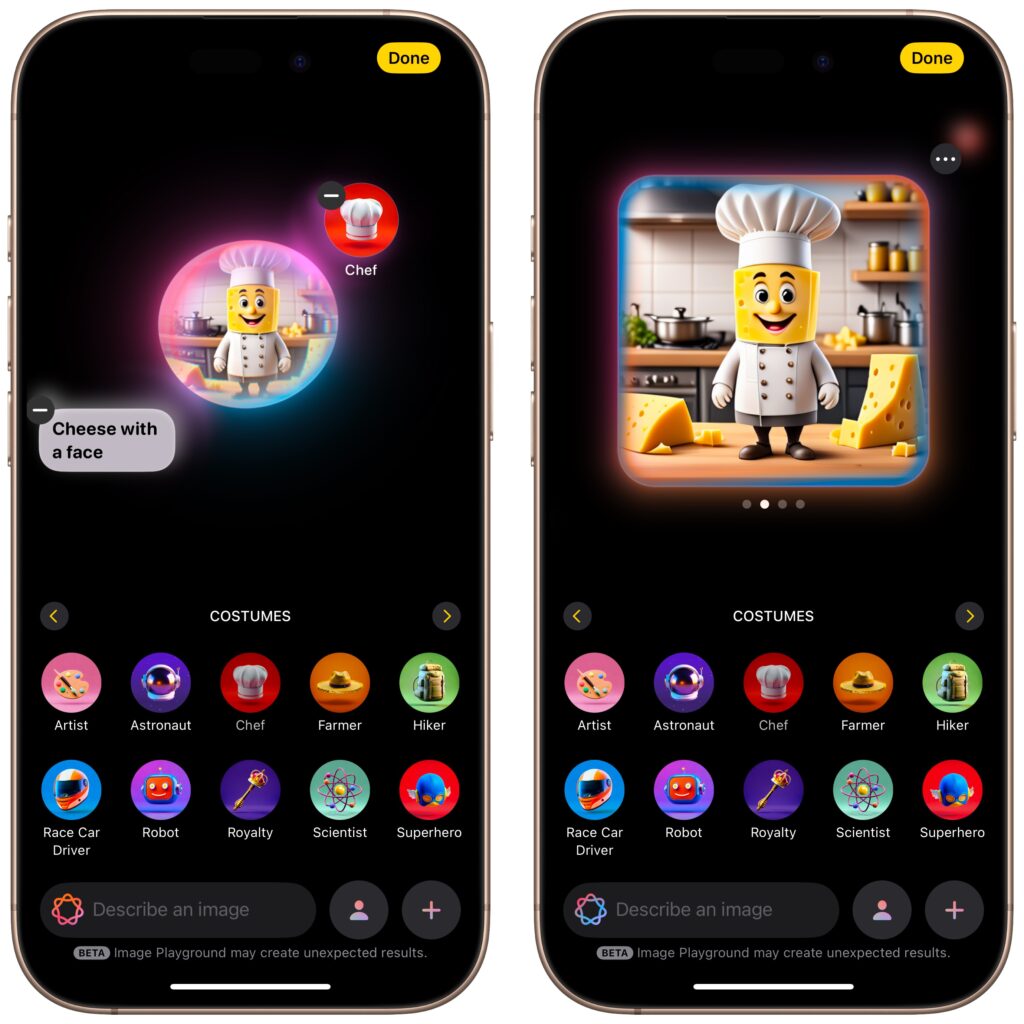 Once you’ve entered a few words of description or selected a person, you can embellish the image by tapping the buttons for suggested themes, costumes, accessories, and places. Each addition causes Image Playground to generate a new image, and swiping left on that image pushes it to try again. Tap the ••• button to save or share an image you like. Saved images become available on all your devices.