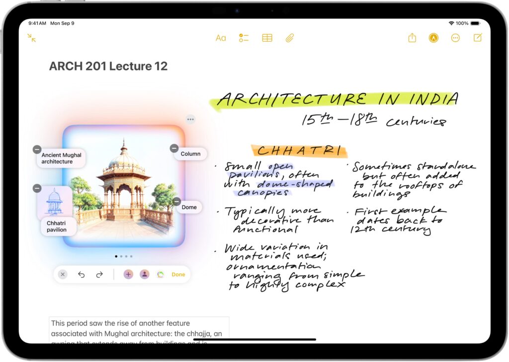 In iPadOS 18.2, the Notes app now offers an Apple Intelligence-powered Image Wand tool for those taking notes with an Apple Pencil. Make a rough sketch with your Apple Pencil, select Image Wand, draw a circle around your sketch, and Image Wand will turn it into a polished image. If your circle also contains text, Image Wand considers it when building the final image.