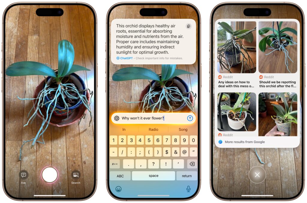 When you upgrade to iOS 18.2 on an iPhone 16, the Camera Control button gains a new capability: Visual Intelligence. Press and hold it (whenever the Camera app isn’t already open, since that will trigger video recording), and Visual Intelligence presents Ask and Search buttons on either side of the shutter button. Tapping Ask causes ChatGPT to describe the image and lets you pose follow-up queries, and tapping Search performs a Google reverse image search; tap any of the results to load it. (If you can’t immediately tap Ask or Search, press the Camera Control button again or tap the shutter button to freeze the image temporarily.)