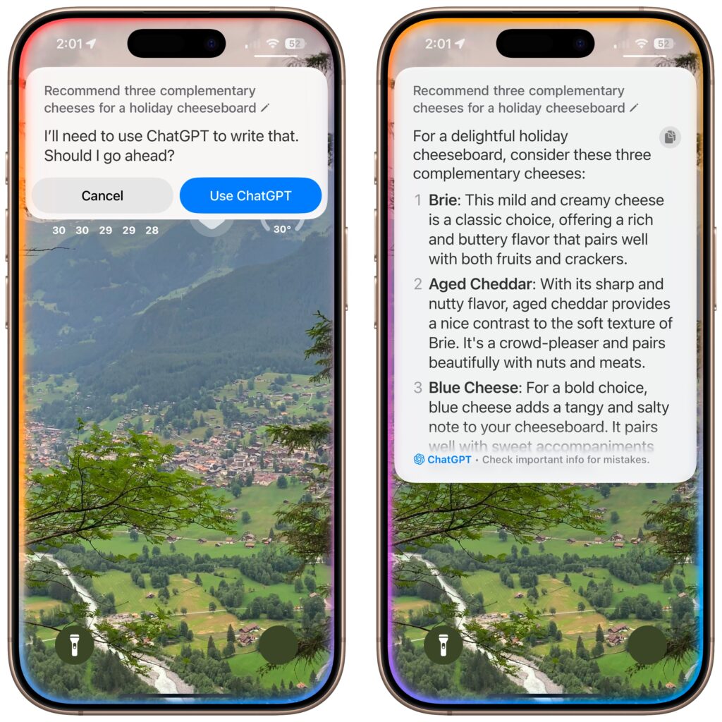 Perhaps the most anticipated enhancement to Apple Intelligence is the integration of ChatGPT into Siri. Unfortunately, if your goal is to converse fluidly with ChatGPT, you may be better off using OpenAI’s ChatGPT app, perhaps triggered by the Action button or a widget. The problem is that unless you explicitly direct a Siri query by starting with “Ask ChatGPT,” Siri may try to answer with its own Web search or trigger a command, leading to inexplicable and unhelpful responses. Even when you get Siri to ask ChatGPT for a response, there’s no option to have it read back to you aloud, as with ChatGPT’s Advanced Voice Mode.