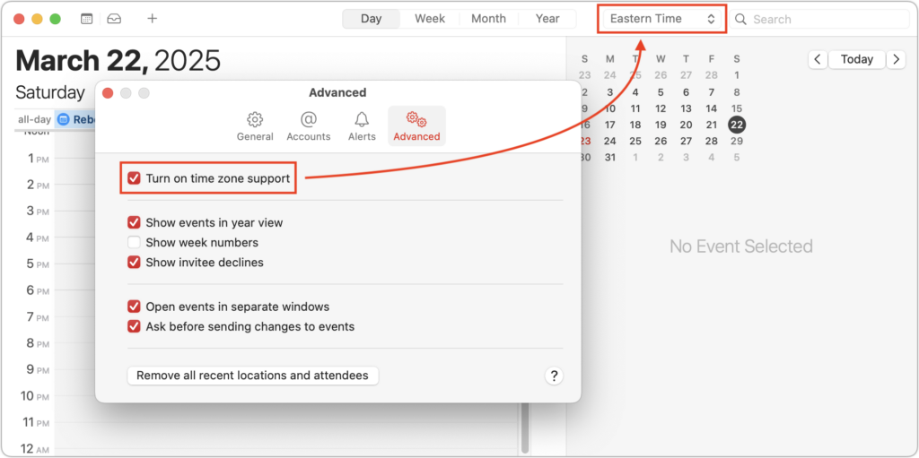 - Calendar time zone overrides: You can make the Calendar app display events as if you were in a different time zone. This feature can help you confirm that events scheduled in another time zone show up at the correct times. On the iPhone or iPad, enable Settings > Apps > Calendar > Time Zone Override. Be careful not to forget about this override, or it may lead to confusion later. On the Mac, go to Calendar > Settings > Advanced, select “Turn on time zone support,” and choose a time zone from the pop-up menu that appears near the upper-right corner of the window.